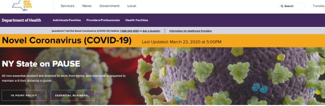 미국이 연방제 국가임을 감안해 실제 코로나 바이러스 대응을 진두지휘하고 있는 주정부 홈페이지도 들어가 봤다. 현재 미국에서 가장 확진자가 많이 나타났을 뿐 아니라 적극적이고 효과적인 대책 실행으로 높은 평가를 받고 있는 뉴욕주 홈페이지를 살펴봤다. 뉴욕주 역시 다른 홈페이지들과 크게 다르지 않았다. 첫 화면 전면부터 주민들을 안심시키기 위한 것으로 보이는 “뉴욕주 병원 수용력 증가”에 관한 주지사 담화문이 크게 나와 있었다. <코로나19 업데이트> 아이콘을 클릭해 들어가면, 신종 코로나 바이러스와 뉴욕주 잠시 멈춤이라는 제목이 나오고, 그 아래 “모든 비핵심 분야 노동자들은 집에서 근무하고, 모든 사람들은 공공 장소에서 다른 사람과 6피트 이상 거리를 유지해야 한다”는 지침이 나와 있다. 다시 그 아래 뉴욕주의 코로나 관련 10대 정책과 핵심 업무를 설명하는 아이콘이 있다. 뉴욕주 내 코로나 확진자 분포를 알리는 자료는 <당신이 알아두어야 할 것들>과 핵심 서비스 안내, 유료 병가, 시민 협력 방법 등을 소개한 다음 거의 맨 마지막에 <확진자 사례 보기>라는 아이콘을 클릭하고 들어가야 볼 수 있다.